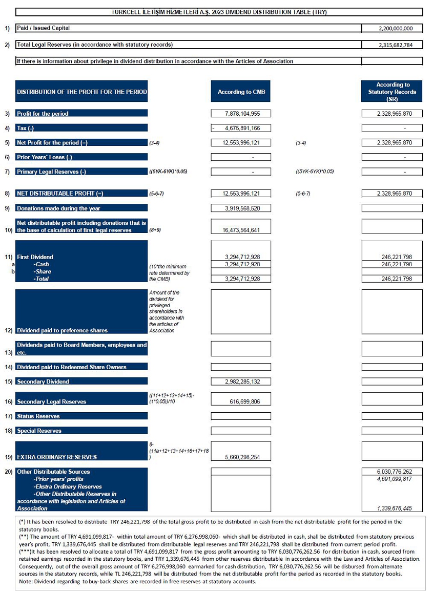 As per our Company's Articles of Association and Dividend Distribution Policy; our Company’s Board of Directors has taken the decision to submit the distribution of our Company’s dividend in a gross amount of TRY 6,276,998,060 equivalent of a gross dividend of TRY 2.8531809 (net TRY 2.5678628) per ordinary share with a nominal value of TRY 1 to the shareholders in cash on December 5, 2024, within the scope of the principles set forth in the legislation to the approval of the Ordinary General Assembly of Shareholders for fiscal year 2023, according to the dividend distribution table which has been prepared for the related fiscal years.