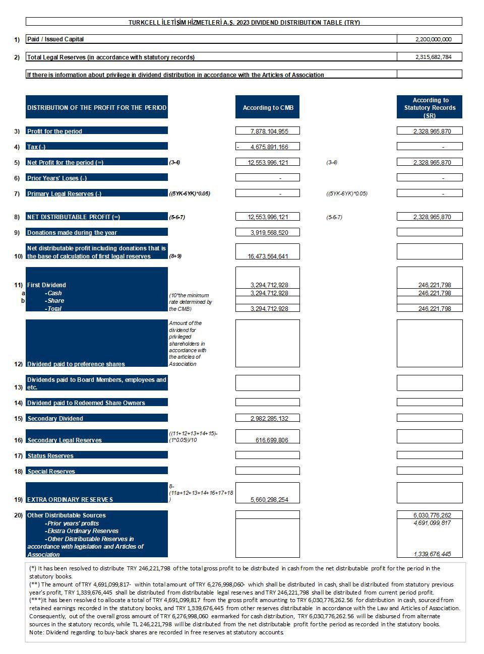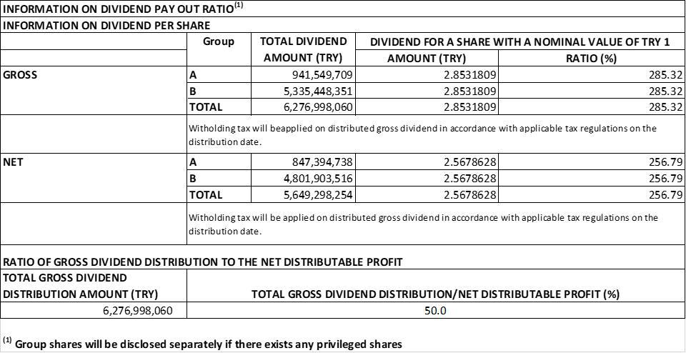 ·Following the voting of the Board of Directors’ decision regarding the agenda item on the distribution of dividend for fiscal year 2023; the distribution of a dividend in gross amount of TRY 6,276,998,060, equivalent to a gross cash dividend of TRY 2.8531809 (net TRY 2.5678628) per ordinary share with a nominal value of TRY 1, to the shareholders on December 5, 2024, in accordance with the announced dividend distribution table and dividend per share table, was approved.