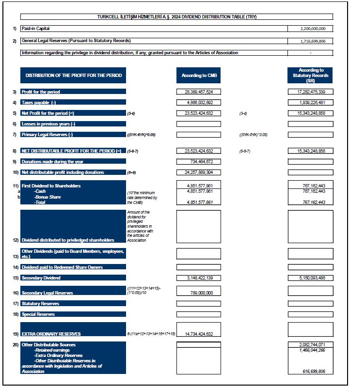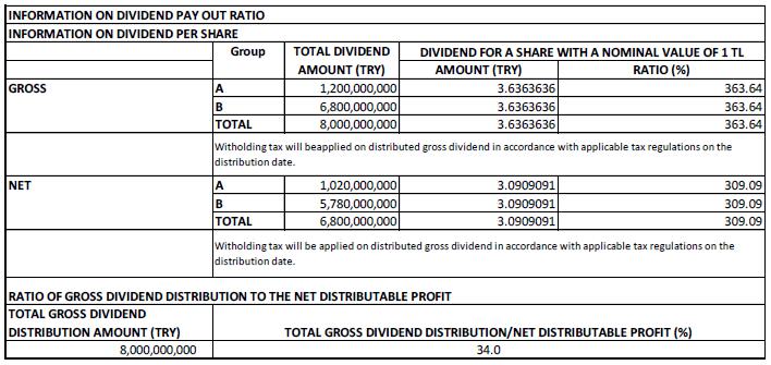 ·Following the voting of the Board of Directors’ decision regarding the agenda item on the distribution of the dividend for fiscal year 2024; the distribution of a dividend in a gross amount of TRY 8,000,000,000, equivalent to a gross dividend of TRY 3.6363636 (net TRY 3.0909091) per ordinary share with a nominal value of TRY 1, in two equal installments to the shareholders in cash on June 20, 2025 and December 26, 2025 in accordance with the announced dividend distribution table and dividend per share table, was approved.