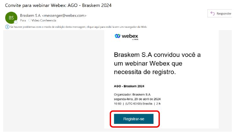 Step 1: You will receive an e-mail from the sender messenger@webex.com containing an invitation to access the Assembly. Clicking on the "Register" button will redirect you to the CISCO WEBEX website.