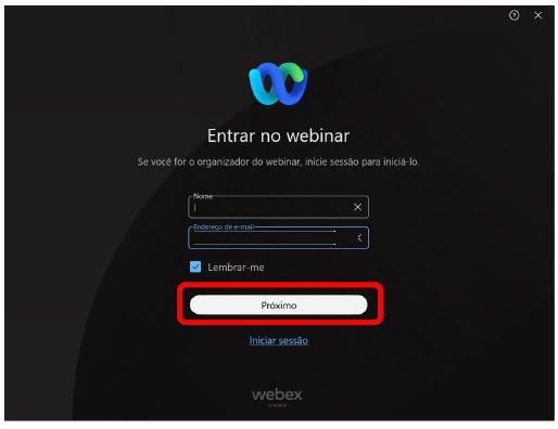 Step 8: When you click on "Start webinar" a new screen will open for you to enter your name and e-mail address, click on "Next".