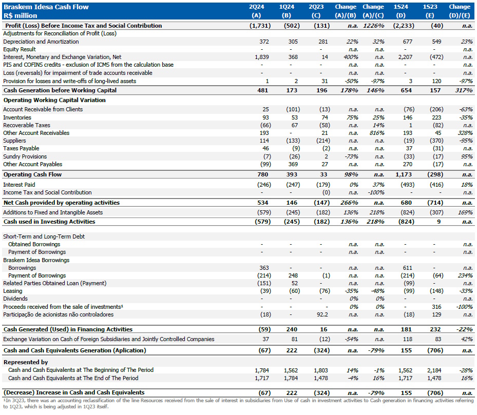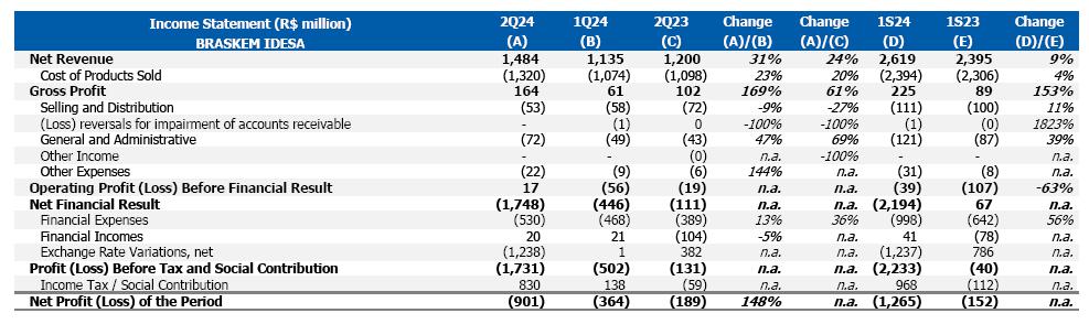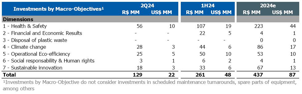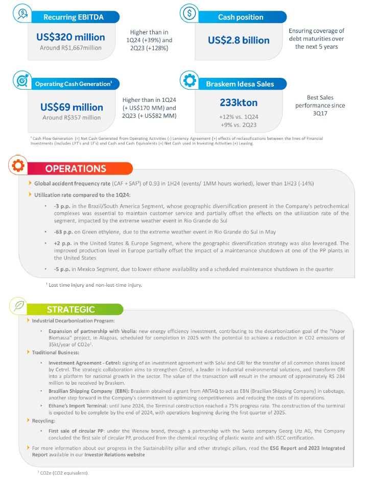 As for safety, the overall frequency rate of accidents with and without lost time (CAF + SAF) was 0.93 events per million hours worked in 1H24, lower than 1H23 (-14%). Braskem and its team members' priority is and always will be the safety of people, which is a permanent and non-negotiable value.