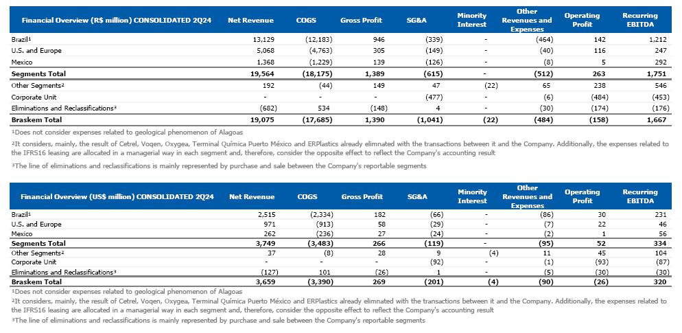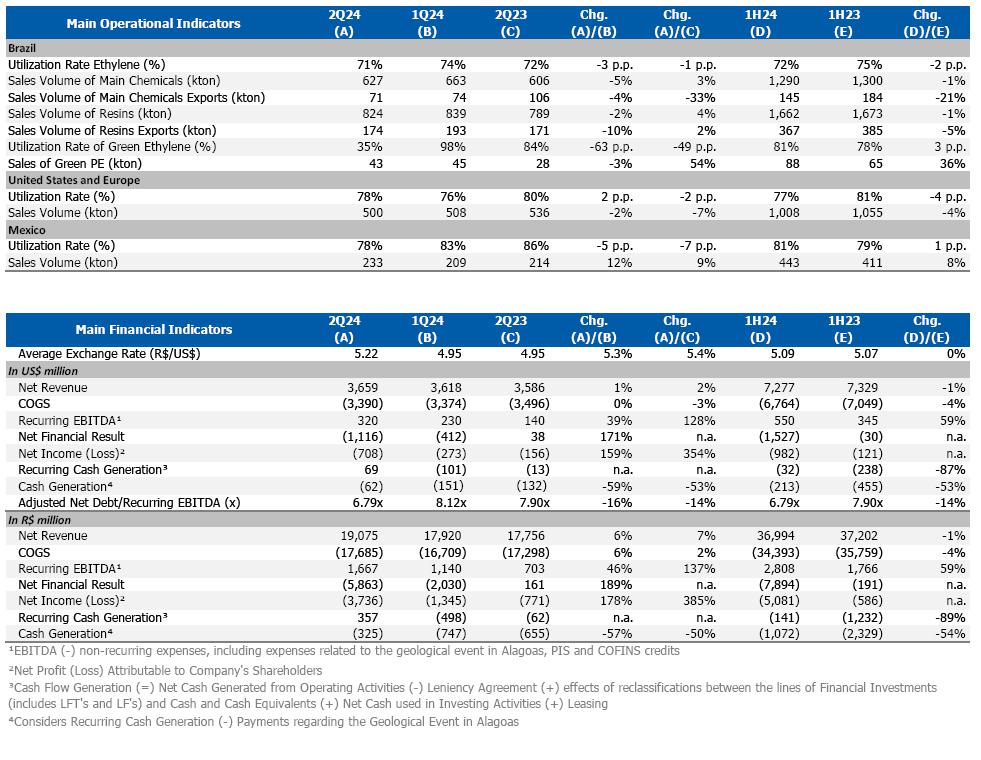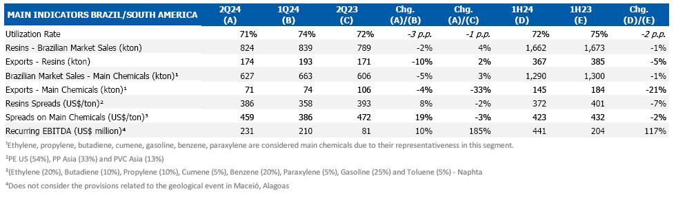 On the operational side, the quarter was marked by scheduled and unscheduled shutdowns, highlighted by the extreme weather event that hit Rio Grande do Sul. In this context, the geographic diversification present in the Company's petrochemical complexes was essential to maintain customer service and partially offset the effects on the utilization rate of the Brazil segment, which was negatively impacted by 4 p.p. due to the shutdown of operations in Triunfo.