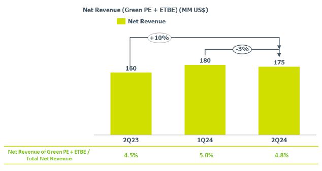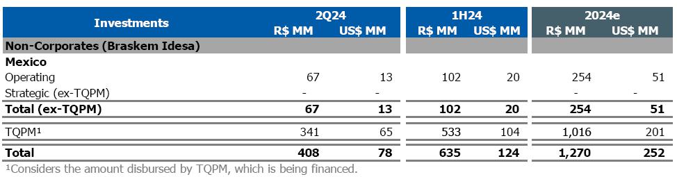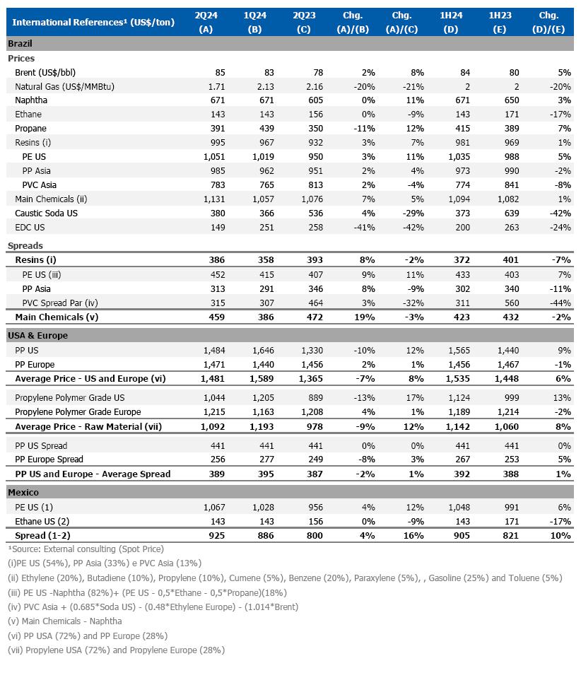 Regarding the dynamics in the international petrochemical market in the quarter, spreads were higher when compared to 1Q24 due to the better balance between global supply and demand combined with the effects of the conflicts in the Red Sea on the dynamics of global logistics, which resulted in an increase in ocean freight rates, positively impacting spreads in the international petrochemical market. Compared to 1Q24, there was an increase in the spreads of resins (+8%) and main chemicals (+19%) in Brazil and PE in Mexico (+4%).