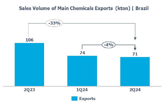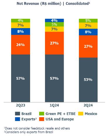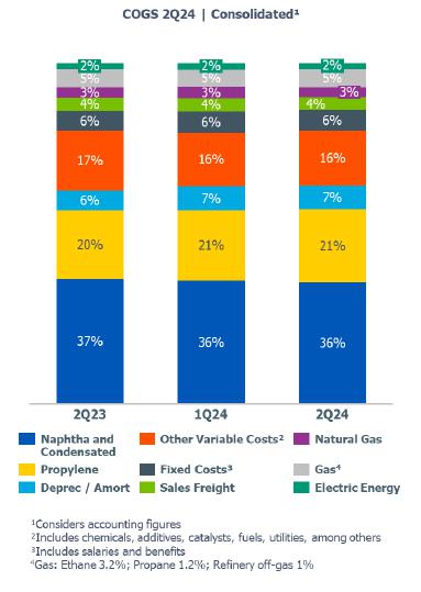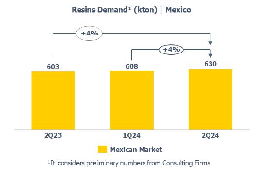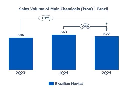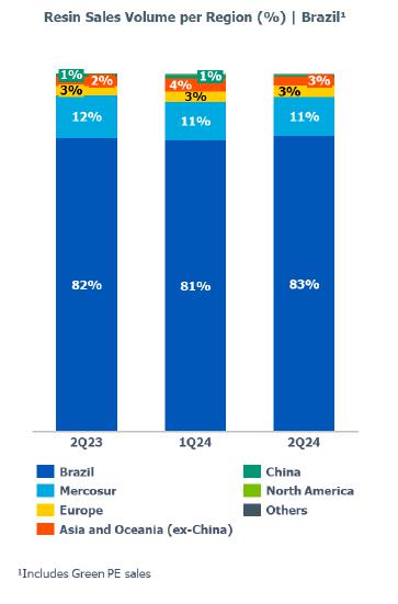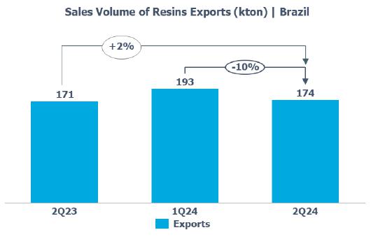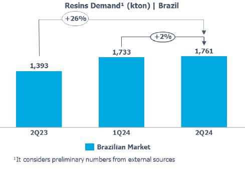 c) Resin sales volume: in the Brazilian market, there was a reduction compared to 1Q24 (-2%), mainly due to the shutdown of operations at the Triunfo Petrochemical Complex in Rio Grande do Sul, partially offset by the allocation of resins produced at the plants in Bahia and São Paulo. Compared to 2Q23, the increase (+4%) is mainly explained by the higher demand in the period due to the inventory build-up in the chain.