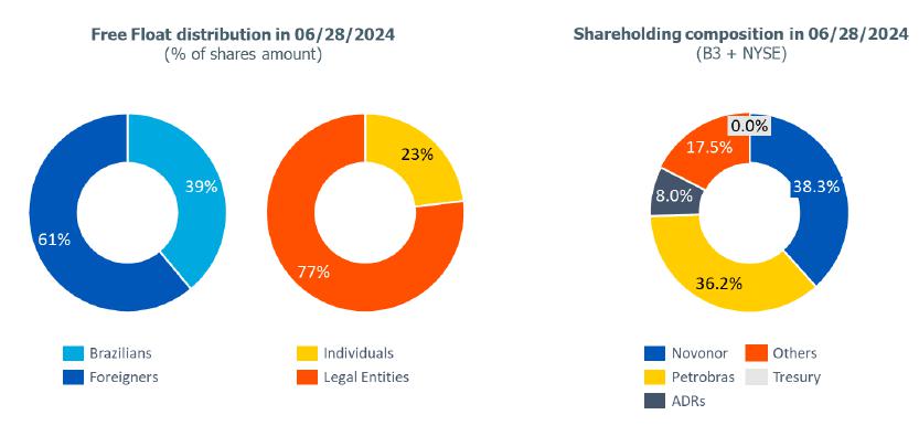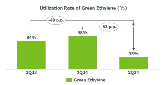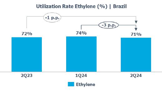 b) Average utilization rate of petrochemical crackers: lower compared to 1Q24 (-3 p.p.) and 2Q23 (-1 p.p.), explained by the shutdown of operations at the Triunfo Petrochemical Complex in Rio Grande do Sul due to the extreme weather event that affected the state in May, partially offset by the increase in the utilization rate at the Bahia and São Paulo Petrochemical Complexes.