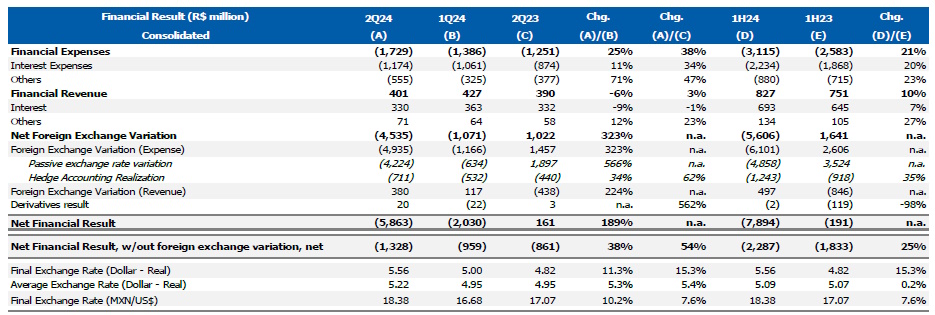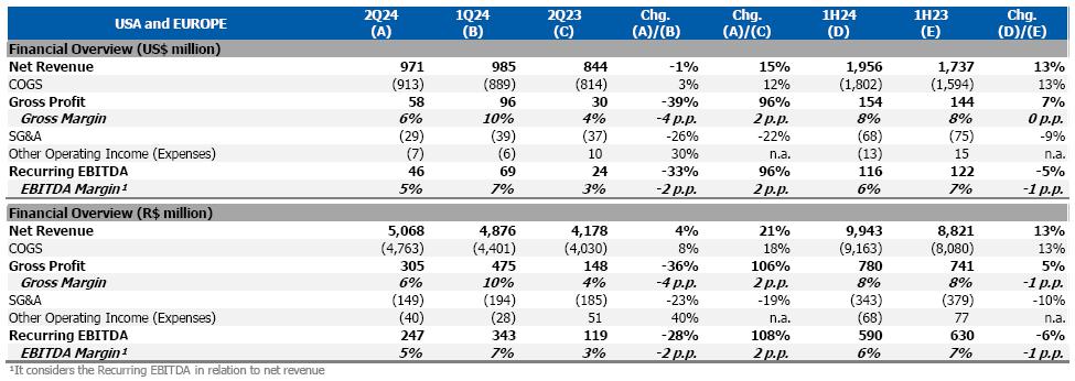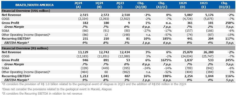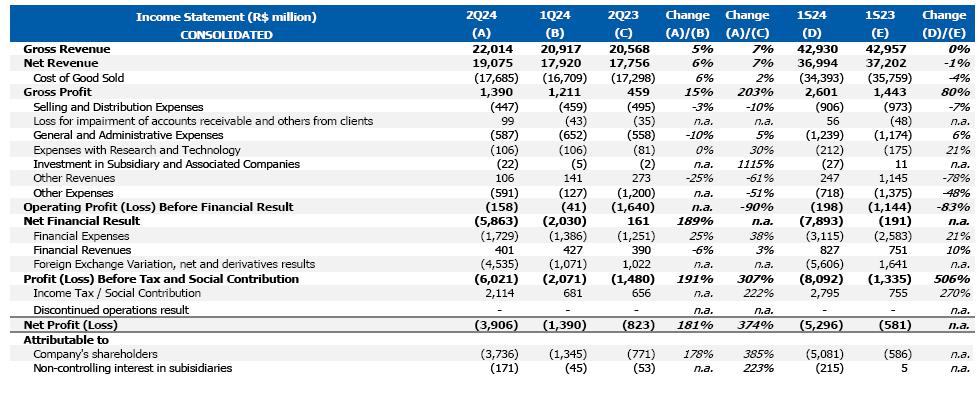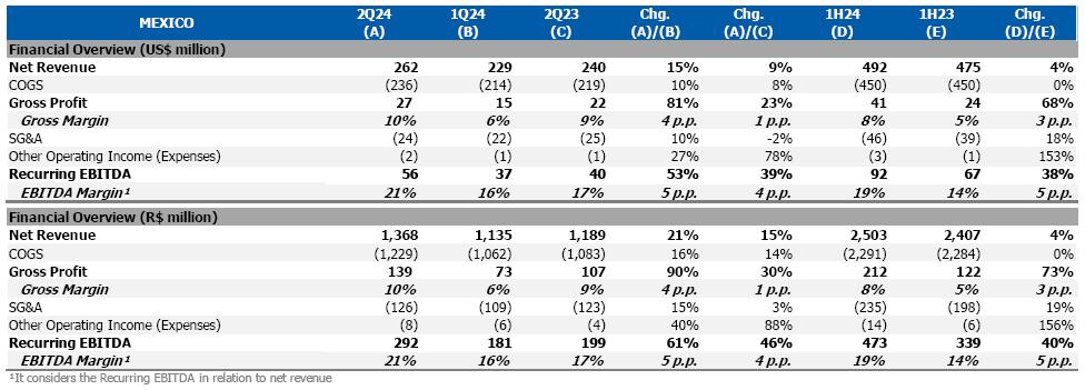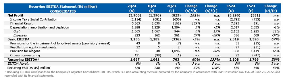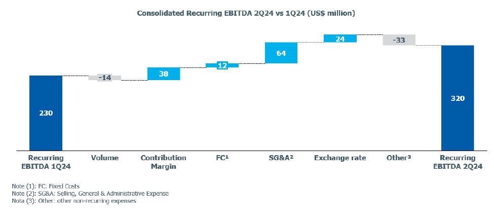 In this context, consolidated Recurring EBITDA in 2Q24 was US$320 million (R$1.7 billion), representing an increase compared to 1Q24 (+39%) and 2Q23 (+128%).