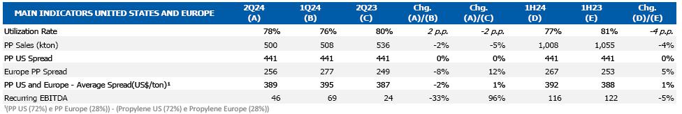 PP spread in the US remained in line when compared to 1Q24, while the PP spread in Europe was lower (-8%) due to the increase in the price of propylene in Europe (+4%), impacted by the lower supply of this product, as a result of operational problems in the petrochemical plants in the region during May.