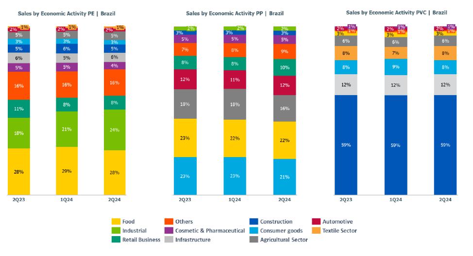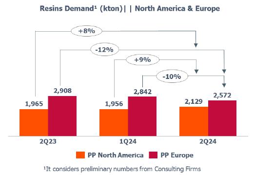 a) Demand for resins in Brazil (PE, PP, and PVC): increased (+2%) compared to 1Q24, mainly explained by (i) higher demand for PE, mainly driven by the food and packaging sector; and (ii) the higher demand for PP driven by the appliances, hygiene, automotive and agricultural sectors. The increase compared to 2Q23 (+26%) is mainly explained by (i) the inventory build-up in the chain; (ii) higher demand from the PP sectors driven by the household appliances, hygiene, and packaging sectors; (iii) higher demand for PE driven by the food, beverage and home care sectors; and (iv) higher demand for PVC driven by the building materials sector.