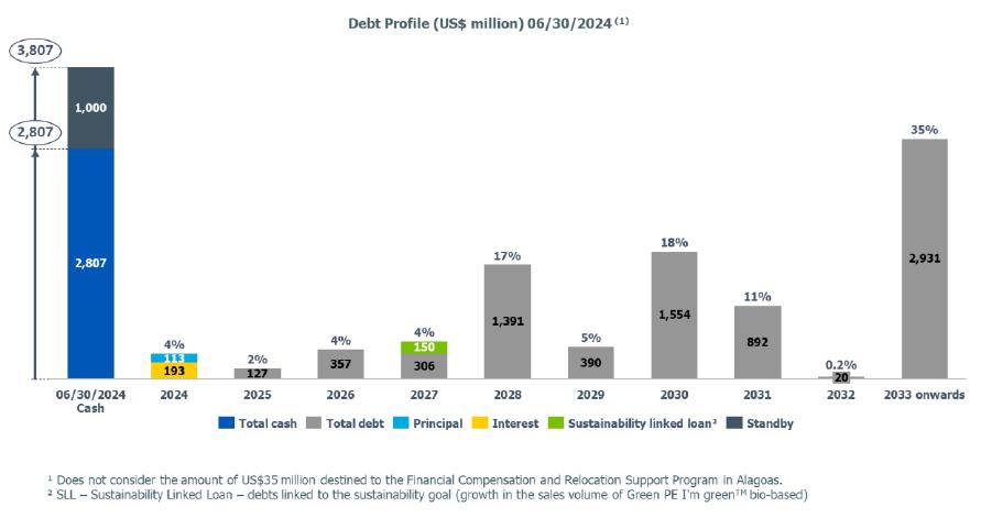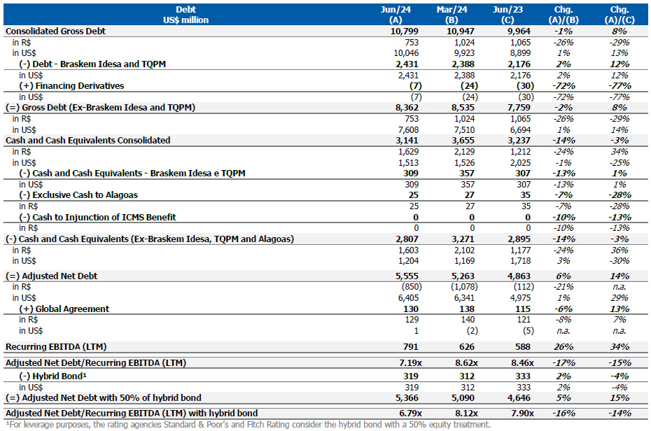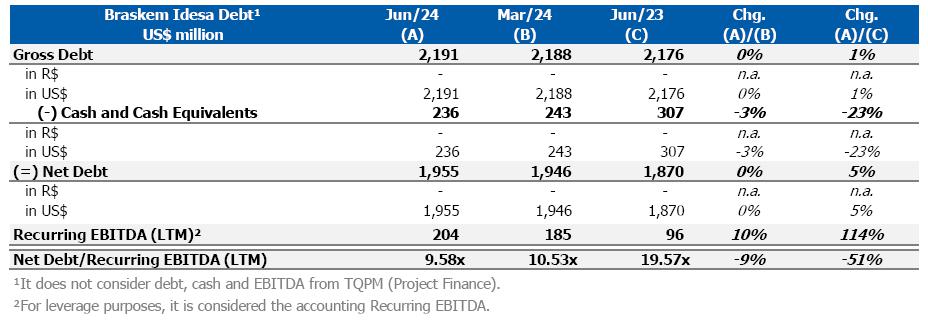 In the period, the Company presented an operational cash generation of US$214 million, 9% higher than 1Q24, mainly explained by the 39% increase in EBITDA compared to the previous quarter. The recurring cash generation was positive in US$69 million, an increase of US$169 million when compared to 1Q24. Considering the payments related to Alagoas, the Company presented a cash consumption of approximately US$62 million.