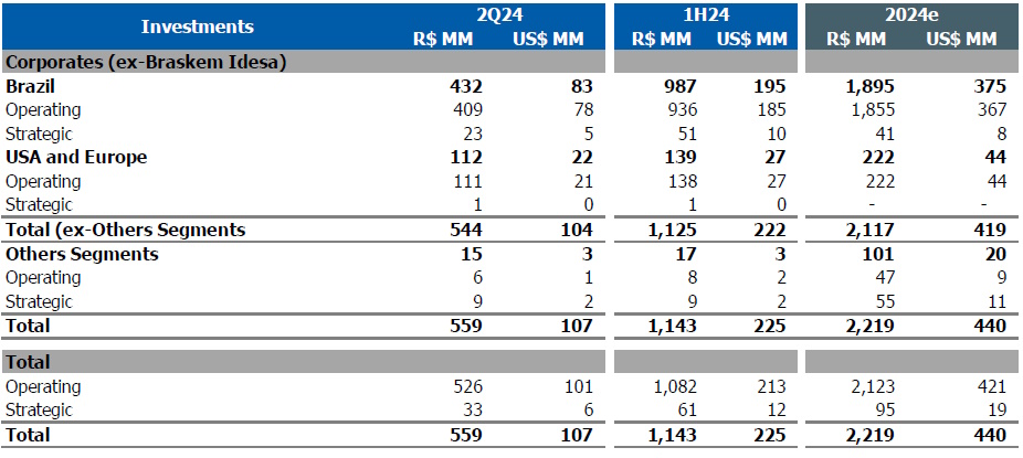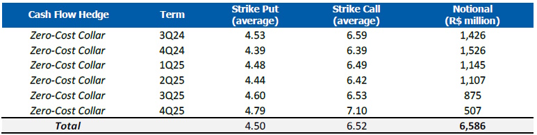 The balance of corporate gross debt ended the quarter at US$8.4 billion, below the previous quarter (-2%), with 96% of maturities concentrated in the long term and 4% in the short term. Regarding net debt, the balance at the end of 2Q24 was US$5.6 billion, an increase of 6% compared to the previous quarter. US$ Corporate leverage ended the quarter at 6.79x.
