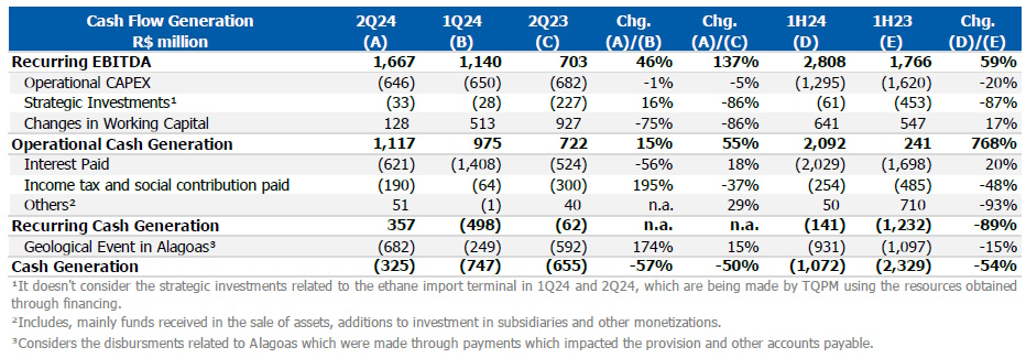 The increase in Recurring EBITDA compared to 2Q23 (+185%) is mainly explained by (i) an increase of 35 kton, or 4%, in the volume of resin sales in the Brazilian market; (ii) an increase of 21 kton, or 3%, in the sales volume of the main chemicals in the Brazilian market; (iii) increase of 3 thousand tons, or 2%, in the volume of resin sales in the international market; (iv) the recognition in the result of the REIQ for approximately US$14 million (R$ 72 million) in 2Q24.