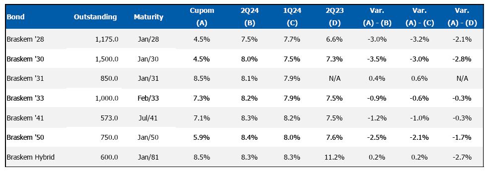 Recurring EBITDA in 2Q24 was US$231 million (R$ 1,212 million), higher than in 1Q24 (+10%), representing 69% of the Company's consolidated Recurring EBITDA segments in dollars in the quarter. Such increase is mainly explained by (i) a 19% increase in the spread of the main chemicals in the international market and (ii) an 8% increase in the average spread of resins in the international market.