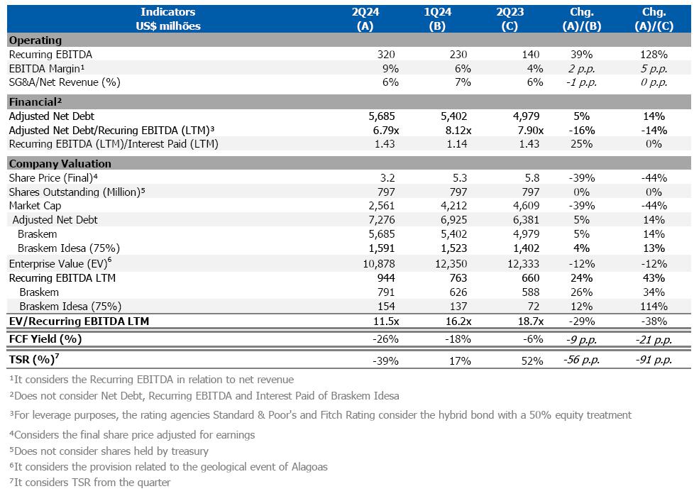 Braskem posts Recurring EBITDA of US$320 million in the quarter, 39% higher than 1Q24 and 128% higher than 2Q23