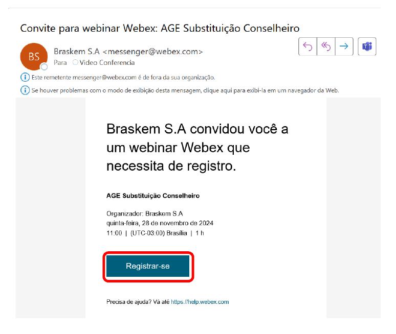 Step 1: You will receive an e-mail from the sender messenger@webex.com containing an invitation to access the Assembly. Clicking on the "Register" button will redirect you to the CISCO WEBEX website.