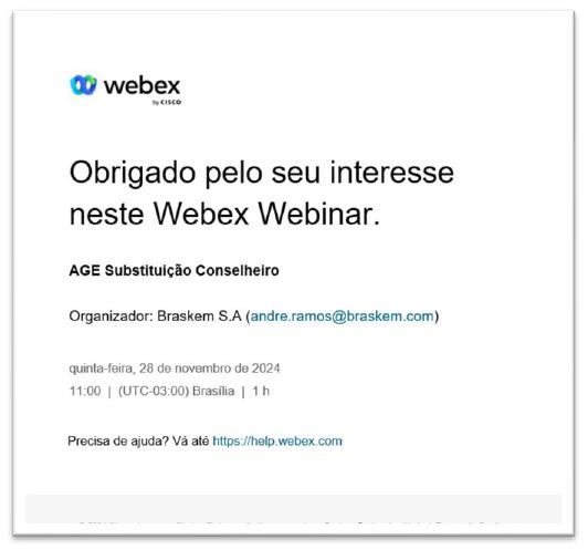 The shareholders of BRASKEM S.A. (“Shareholders” and “Company”, respectively) are hereby called to meet at an Extraordinary General Meeting, in an exclusively digital manner, pursuant to article 5, paragraph 2, item I, and article 28, paragraphs 2 and 3, of CVM Resolution No. 81, of March 29, 2022 (“CVM Ruling 81”), to be held on November 28, 2024, at 11 a.m., through digital platform Webex (“Digital Platform” and “Meeting”, respectively), to resolve upon the following Agenda: