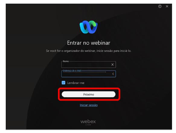 Step 8: When you click on "Start webinar" a new screen will open for you to enter your name and e-mail address, click on "Next".