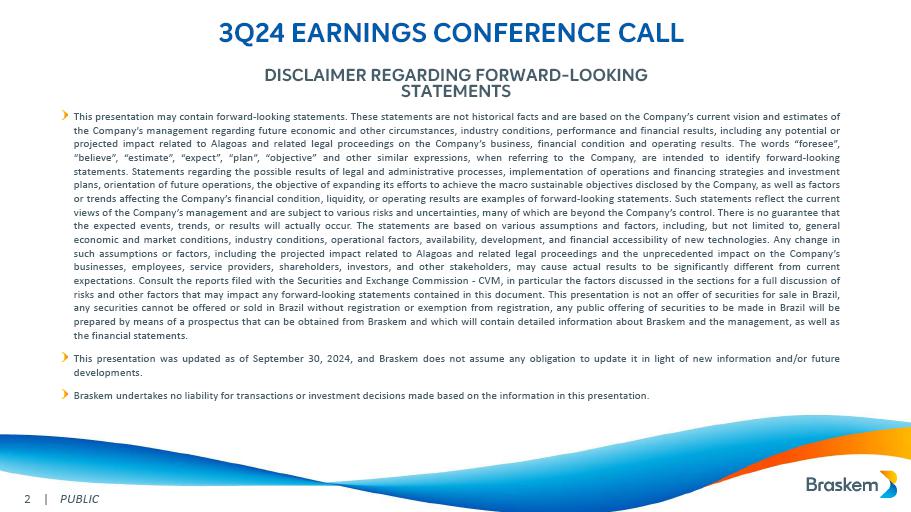 This report on Form 6-K may contain forward-looking statements within the meaning of the Private Securities Litigation Reform Act of 1995. These statements are statements that are not historical facts, and are based on our management’s current view and estimates of future economic and other circumstances, industry conditions, company performance and financial results, including any potential or projected impact of the geological event in Alagoas and related legal proceedings and of COVID-19 on our business, financial condition and operating results. The words “anticipates,” “believes,” “estimates,” “expects,” “plans” and similar expressions, as they relate to the company, are intended to identify forward-looking statements. Statements regarding the potential outcome of legal and administrative proceedings, the implementation of principal operating and financing strategies and capital expenditure plans, the direction of future operations and the factors or trends affecting our financial condition, liquidity or results of operations are examples of forward-looking statements. Such statements reflect the current views of our management and are subject to a number of risks and uncertainties, many of which are outside of the our control. There is no guarantee that the expected events, trends or results will actually occur. The statements are based on many assumptions and factors, including general economic and market conditions, industry conditions, and operating factors. Any changes in such assumptions or factors, including the projected impact of the geological event in Alagoas and related legal proceedings and the unprecedented impact of COVID-19 pandemic on our business, employees, service providers, stockholders, investors and other stakeholders, could cause actual results to differ materially from current expectations. Please refer to our annual report on Form 20-F for the year ended December 31, 2019 filed with the SEC, as well as any subsequent filings made by us pursuant to the Exchange Act, each of which is available on the SEC’s website (www.sec.gov), for a full discussion of the risks and other factors that may impact any forward-looking statements in this presentation.