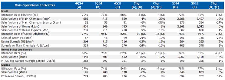 Average utilization rate of petrochemical crackers: reduction compared to 3Q24 (-3 p.p.) mainly explained by (i) seasonality of the period; (ii) operational instability at the Rio Grande do Sul Petrochemical Complex due to adjustments in the plant's electrical network; (iii) scheduled maintenance shutdown at the PVC plant in Bahia, starting at the end of November and ending in January 2025; and (iv) lower availability of feedstock for the Rio de Janeiro petrochemical plant due to the maintenance shutdown of a national supplier.