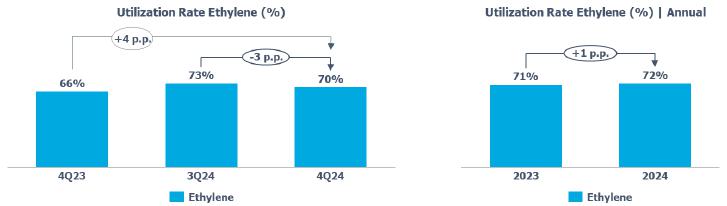 Average utilization rate of PE plants: increased compared to 3Q24 (+3 p.p.), mainly due to (i) the greater supply of ethane by PEMEX, of around 30 thousand barrels per day, in line with the minimum contractual volume; and (ii) the normalization of operations after a scheduled maintenance shutdown in the PE plants, in the previous quarter.