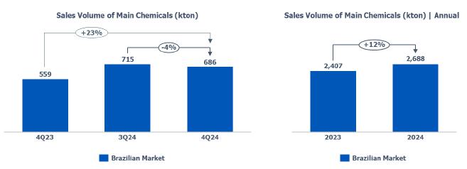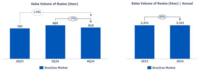 Resin sales volume: in the Brazilian market, a reduction compared to 3Q24 (-7%), mainly due to the decreased demand for PE and PP explained by the seasonality of the period.
