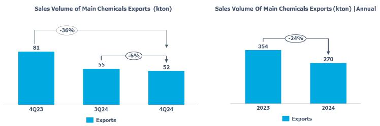 Compared to 2023, the sales volume of main chemicals increased (+12%), mainly due to the higher sales volume of gasoline, ethylene, benzene and paraxylene due to greater availability of product for sale.