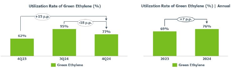 Average utilization rate of green ethylene: lower compared to 3Q24 (-18 p.p.) mainly explained by operational instability at the Rio Grande do Sul petrochemical plant as a result of adjustments to the region's electricity network and a scheduled maintenance shutdown.