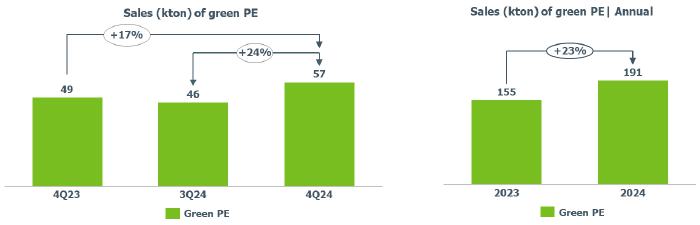 Sales volume of Green PE (I’m greenTM biobased): increased compared to 3Q24 (+24%) mainly due to higher demand for Green PE in Europe and Asia. The increase compared to 4Q23 (+17%) is mainly explained by the greater availability of product for sale.