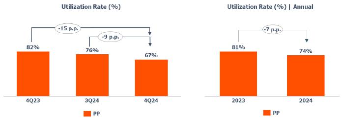 Average utilization rate of PP plants: lower compared to 3Q24 (-9 p.p.) and 4Q23 (-15 p.p.) explained by (i) adjustment of the utilization rate in the United States due to lower demand explained by the seasonality of the period; and (ii) unscheduled maintenance shutdown at plants in Europe.