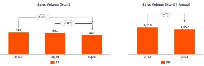 PP sales volume: lower compared to 3Q24 (-10%) and 4Q23 (-12%) explained by (i) the seasonality of the period as a result of the destocking process in the transformation chain; and (ii) lower availability of product for sale in Europe, due to the lower utilization rate.