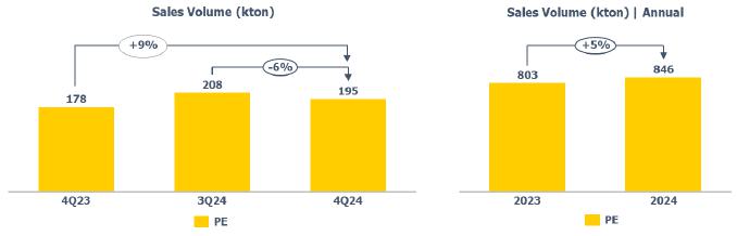 PE sales volume: reduction compared to 3Q24 (-6%), mainly due to seasonality and the process of rebuilding PE inventories.