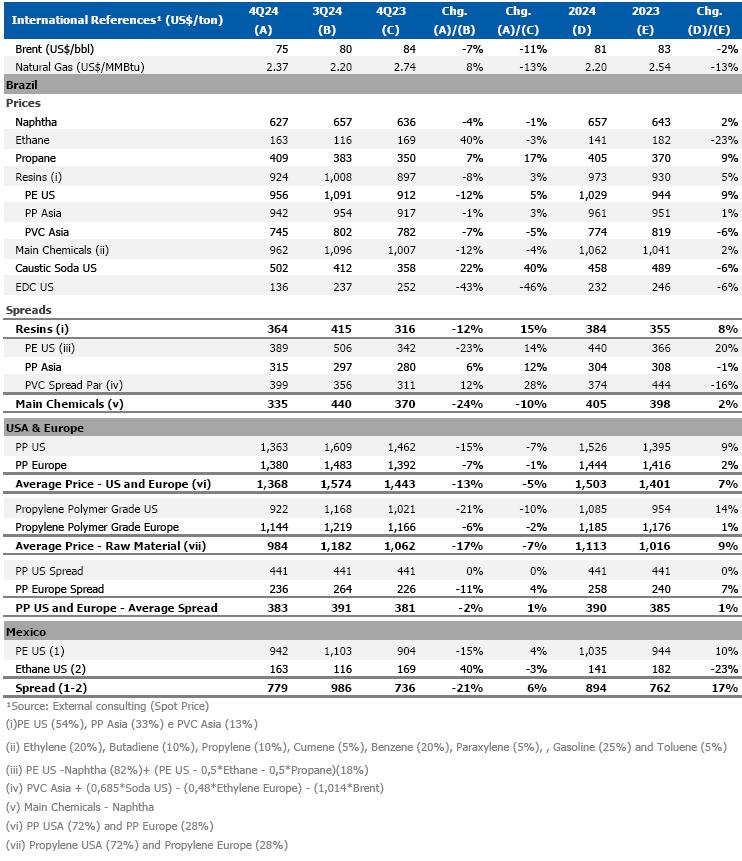 During 4Q24, the main spreads in the international market were lower in relation to the previous quarter and to the average for 2024, with a particular emphasis on the reduction in PE and main chemicals spreads, impacting the Company's result for the quarter.