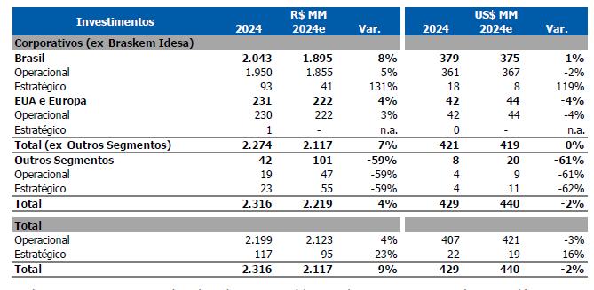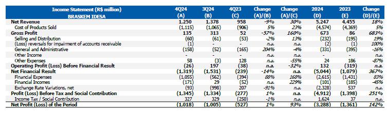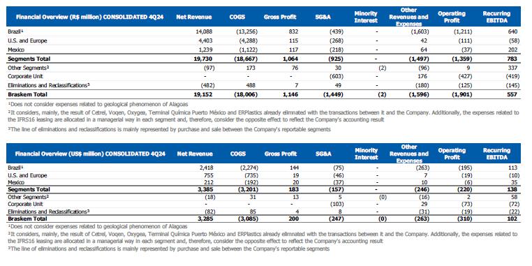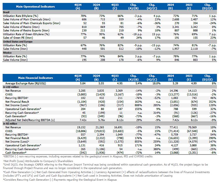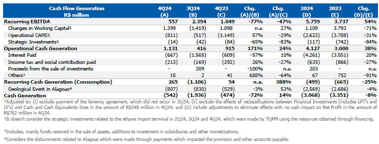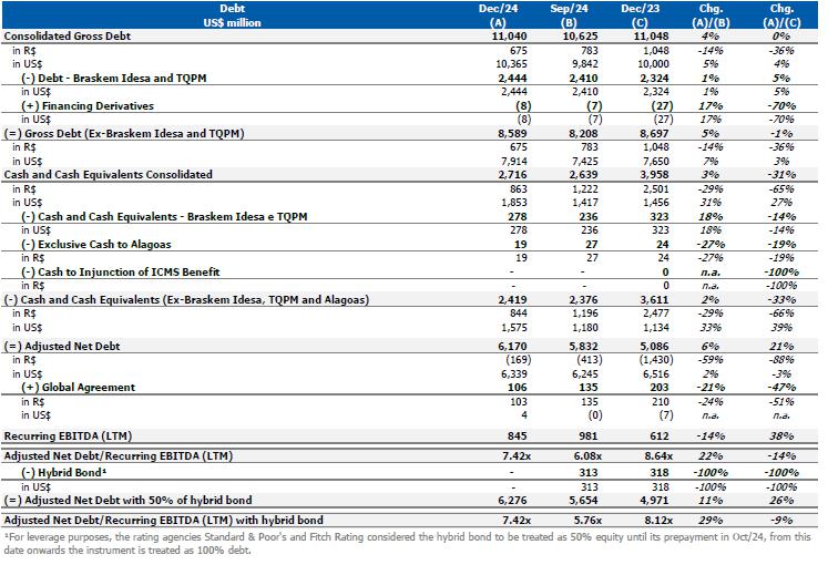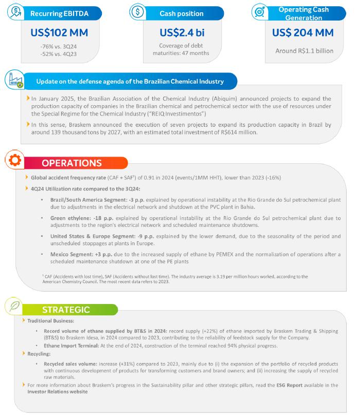 In this context, sales in the Brazilian market were lower compared to the previous quarter, which was partially offset by the higher export volume due to the higher availability of products for export. In this context, the Consolidated Recurring EBITDA for 4Q24, including effects of idleness, inventory and other non-cash provisions, was US$102 million (R$557 million), with an operating cash generation of R$1.1 billion and a recurring cash generation of R$265 million. Including payments related to Alagoas, the Company's cash consumption was R$542 million.