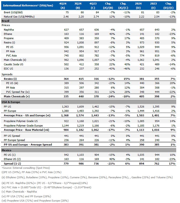 During 4Q24, the main spreads in the international market decreased compared to the previous quarter and were lower than the average for the year 2024, with emphasis on the reduction in PE and main chemical spreads, impacting the Company's results in the quarter.