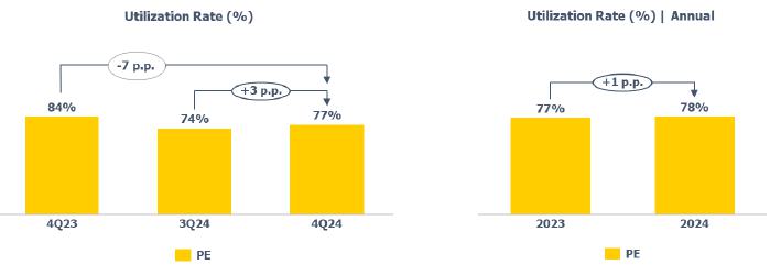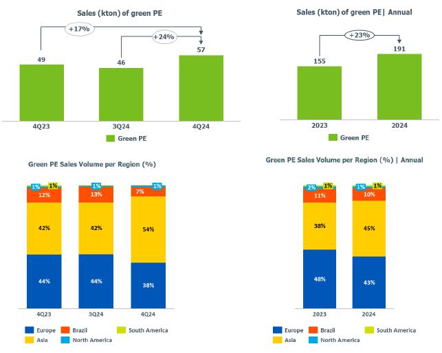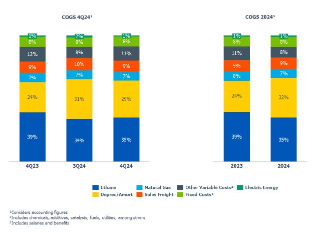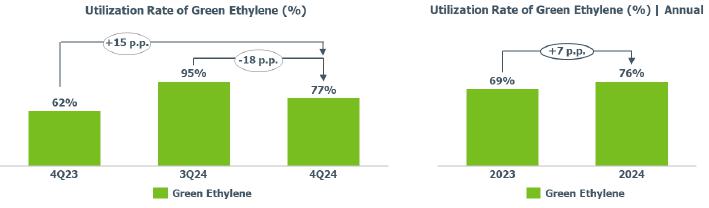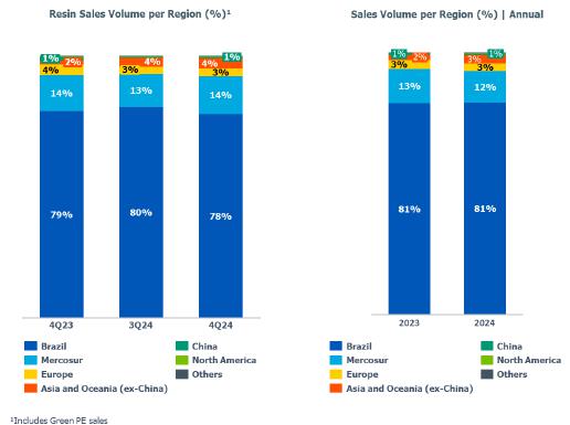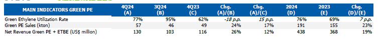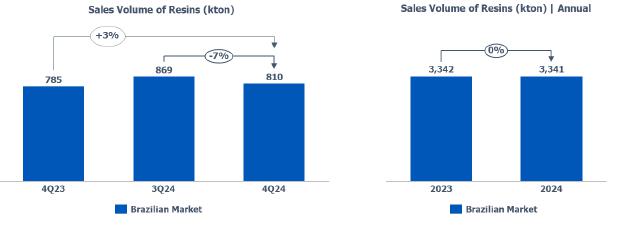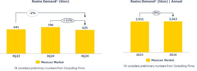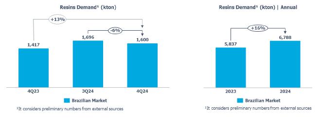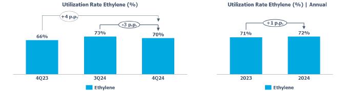 In terms of demand for 4Q24, it was noted in the Brazilian market the lowest quarterly demand for resins in 2024, primarily due to the slowdown in industrial economic activity, the maintenance of interest rates at historically high levels, and the buildup of inventories by the processing chain that occurred in 3Q24, a movement also observed in the United States.