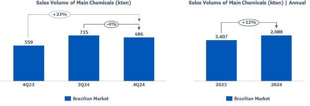 The volume of resin sales in the Brazilian market was lower compared to 3Q24, mainly due to the seasonality of the period, partially offset by the higher volume of exports to South America. The sales volume of the main chemicals was lower compared to the previous quarter, primarily due to reduced product availability for sale, associated with a lower utilization rate during the quarter.