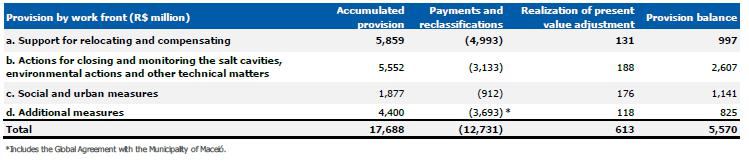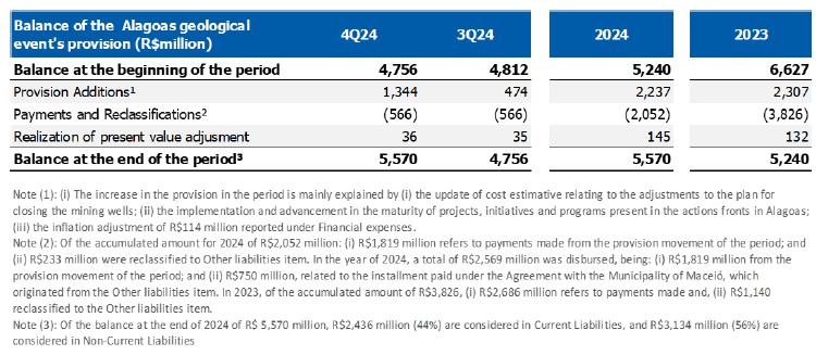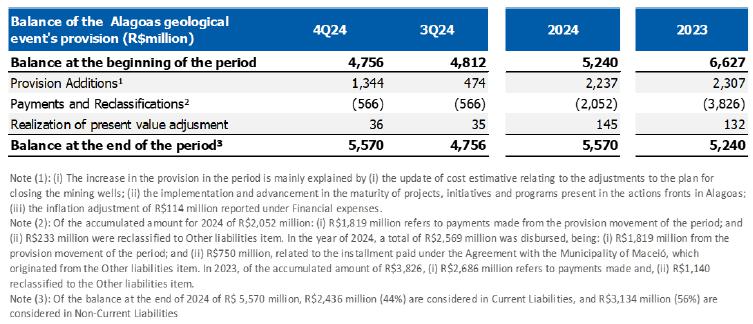 The Company's Management, based on its assessment and that of its external advisers, taking into account the short and long-term effects of technical studies prepared, available information and the best estimate of expenses for implementing the measures related to the geological event in Alagoas, presents the following changes to the provision in the fiscal years ended December 31, 2024 and 2023: