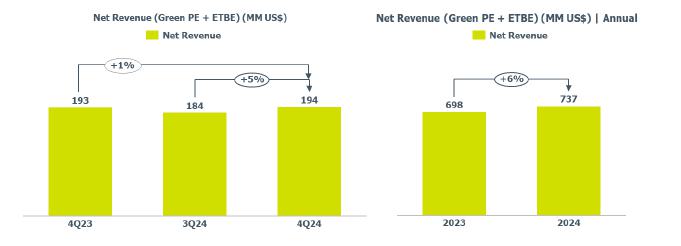 The average resin spread was lower compared to 3Q24 (-12%), mainly influenced by the USA PE spread, due to the seasonality of the period associated with higher PE availability in the United States, which registered record production in November 2024.