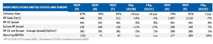 PP spread in the United States remained in line with 3Q24, while PP spread in Europe was lower (-11%), due to the reduction (-7%) in the PP, due to the lower seasonal demand and lower propylene price in Europe (-6%).