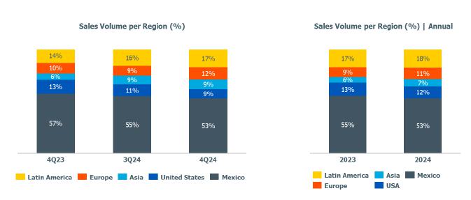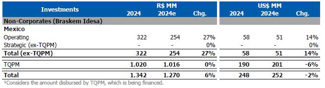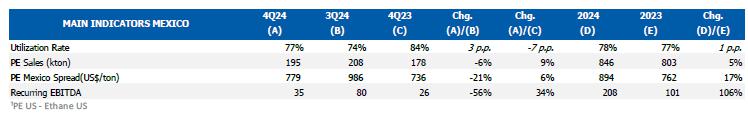 PE spread in Mexico was lower (-21%) compared to 3Q24, due to the lower PE price in the USA (-15%), as explained previously and the higher ethane price (+40%) explained by (i) the increase in the price of natural gas due to the start of winter in the northern hemisphere; (ii) the resumption of demand after the normalization of petrochemical plants in the region, which had been affected in 3Q24 by the hurricane season; and (iii) the increase in export volumes, due to the start-up of the Plaquemines LNG terminal in the Gulf.