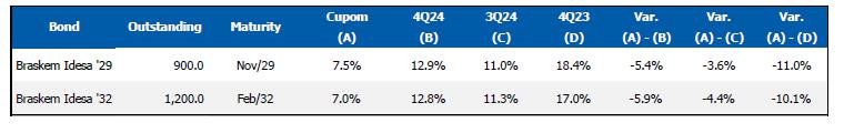 In October 2024, the Company issued a debt instrument in the international market (bond) in the amount of US$850 million at a cost of 8.00% p.a. In November 2024, the Company completed the repurchase offer for the Hybrid Bond, buying back a principal amount of US$369 million, with the total outstanding amount of US$241 million.