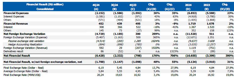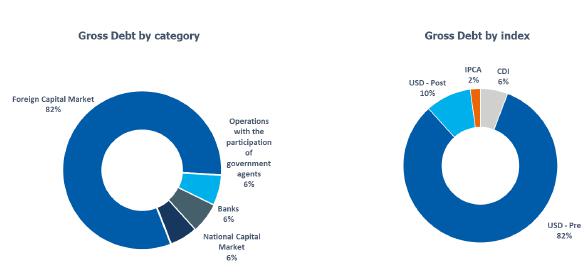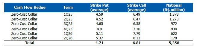 On December 31, 2024, the balance of the corporate gross debt was U$8.6 billion, with 92% of debts in US dollars, an average term of around 9 years, and 68% of the debt maturing from 2030 onwards. The average weighted cost of the Company's corporate debt was exchange variation +6.34% p.a.