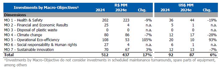 Regarding environmental actions, in compliance with the Agreement for Socio-environmental Reparation, Braskem continues implementing the actions established in the environmental plan approved by the MPF and sharing the results of its actions with the authorities As one of the results of the collapse of cavity 18, as agreed in the Socio-Environmental Reparation Agreement, a specialized company is preparing a specific Environmental Diagnosis to evaluate potential impacts caused by the collapse of said cavity. The delivery of the diagnosis is expected for the first half of 2025.