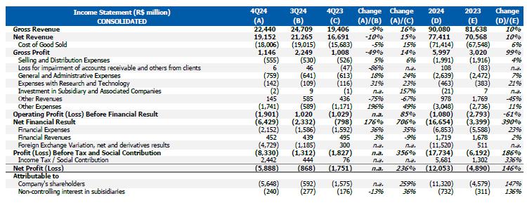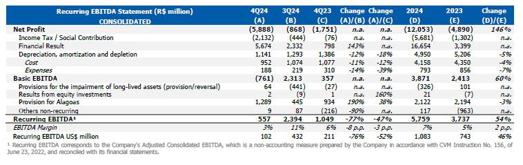 In the year, consolidated Recurring EBITDA was US$1.1 billion, up 46% from 2023, with negative recurring cash generation of approximately R$560 million.