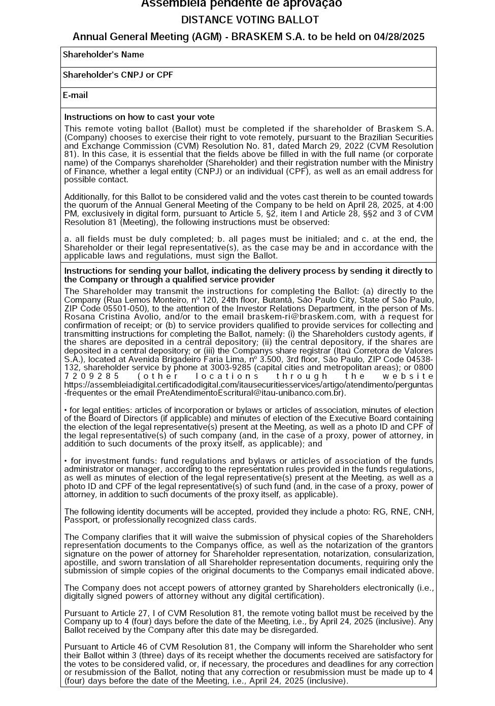 This report on Form 6-K may contain forward-looking statements within the meaning of the Private Securities Litigation Reform Act of 1995. These statements are statements that are not historical facts, and are based on our management’s current view and estimates of future economic and other circumstances, industry conditions, company performance and financial results, including any potential or projected impact of the geological event in Alagoas and related legal proceedings and of COVID-19 on our business, financial condition and operating results. The words “anticipates,” “believes,” “estimates,” “expects,” “plans” and similar expressions, as they relate to the company, are intended to identify forward-looking statements. Statements regarding the potential outcome of legal and administrative proceedings, the implementation of principal operating and financing strategies and capital expenditure plans, the direction of future operations and the factors or trends affecting our financial condition, liquidity or results of operations are examples of forward-looking statements. Such statements reflect the current views of our management and are subject to a number of risks and uncertainties, many of which are outside of the our control. There is no guarantee that the expected events, trends or results will actually occur. The statements are based on many assumptions and factors, including general economic and market conditions, industry conditions, and operating factors. Any changes in such assumptions or factors, including the projected impact of the geological event in Alagoas and related legal proceedings and the unprecedented impact of COVID-19 pandemic on our business, employees, service providers, stockholders, investors and other stakeholders, could cause actual results to differ materially from current expectations. Please refer to our annual report on Form 20-F for the year ended December 31, 2019 filed with the SEC, as well as any subsequent filings made by us pursuant to the Exchange Act, each of which is available on the SEC’s website (www.sec.gov), for a full discussion of the risks and other factors that may impact any forward-looking statements in this presentation.