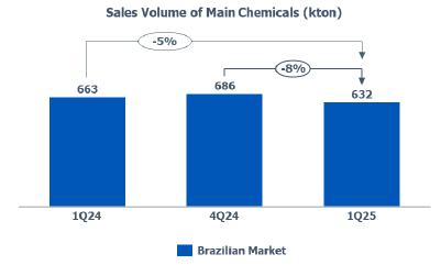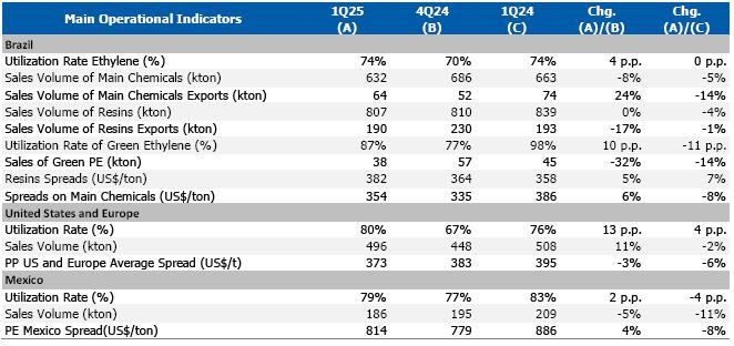Main chemicals sales volume[1]: in the Brazilian market, a reduction compared to 4Q24 (-8%), and to 1Q24 (-5%), mainly explained by the higher volume of internal transfers of ethylene and propylene for resins production.