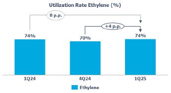 Average utilization rate of PE plants: higher compared to 4Q24 (+2 p.p.), mainly due to the increased supply of ethane through the Fast Track solution, which was around 21.3 thousand barrels per day, compared to 19.2 thousand barrels in 4Q24. The volume of ethane supplied by PEMEX was around 28.3 thousand barrels per day compared to 30.3 thousand barrels in 4Q24.
