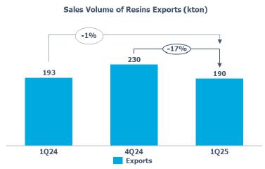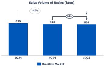 Resin sales volume: in the Brazilian market, sales volume remained in line with 4Q24, highlighting the increase in PE and PP sales volume by 2% and 3%, respectively, offset by a reduction in PVC sales volume by 16%.