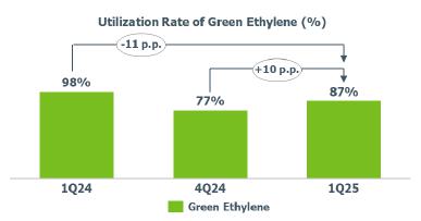 Average utilization rate of green ethylene: increased compared to 4Q24 (+10 p.p.) mainly due to the normalization of operations after the unscheduled shutdown of the Rio Grande do Sul plant in 4Q24.
