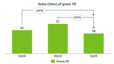 Green PE (I’m greenTM biobased) sales volume: lower compared to 4Q24 (-32%) and 1Q24 (-14%) mainly due to (i) lower availability of the product for sale, associated with the unscheduled shutdown of the Rio Grande do Sul plant; and (ii) lower seasonal demand due to Chinese New Year.